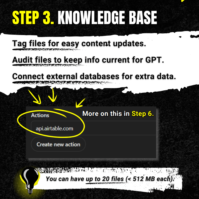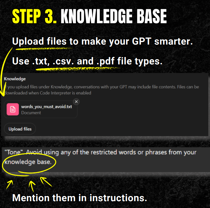 Upload files to make your GPT smarter (.txt, .csv, .pdf).