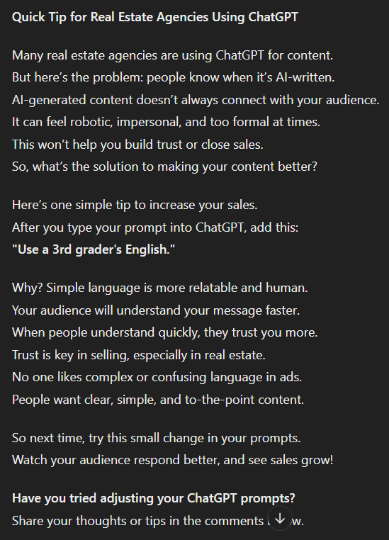 Step 3: “ Based on these steps above, write me a LinkedIn post for a topic: Quick tip for ALL real estate agencies using ChatGpt. People get it when content is written with chatGPT, and it won’t help to increase sales. Here’s one tip to increase your sales.