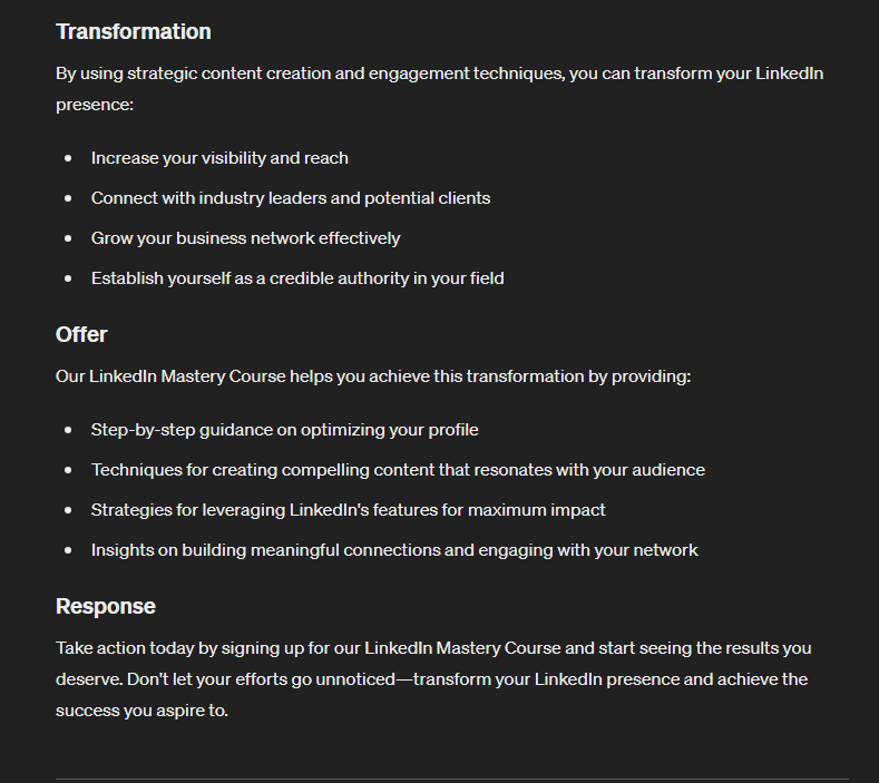 Example: "Our copywriting course helps you master the PASTOR method, ensuring your posts are always engaging and effective."